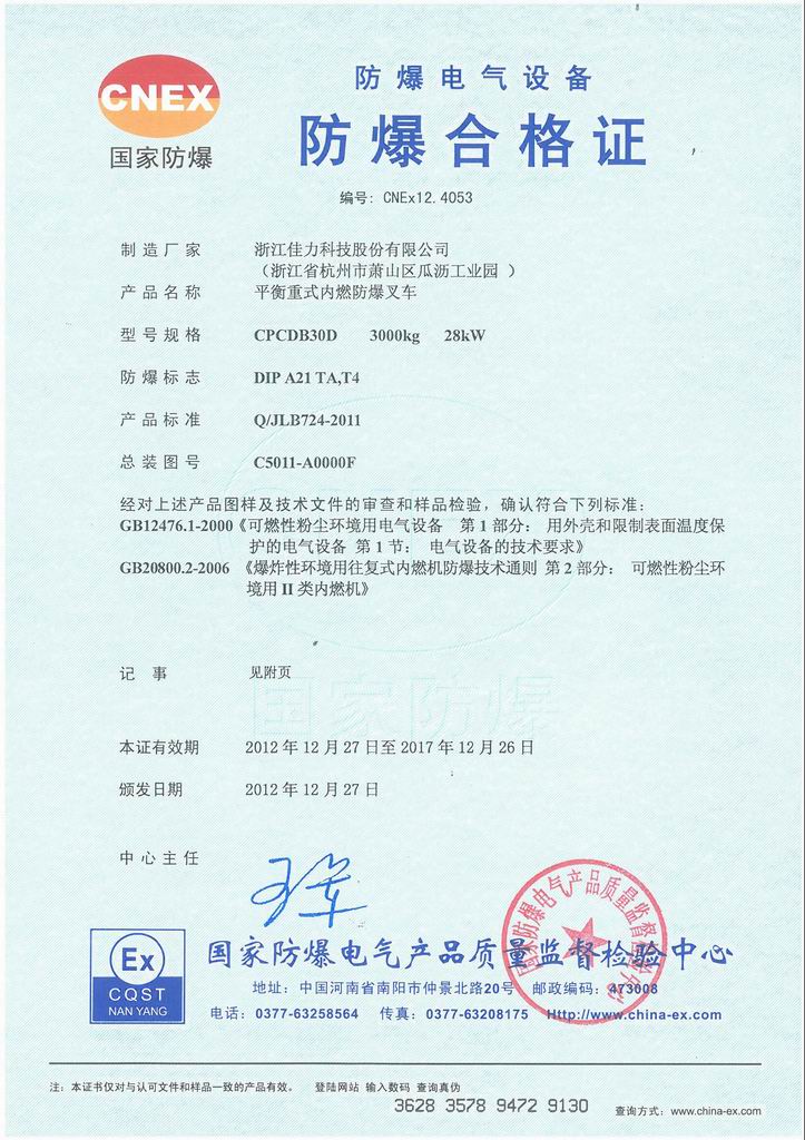 CPCDB35 平衡重式內燃防爆叉車 粉塵證書