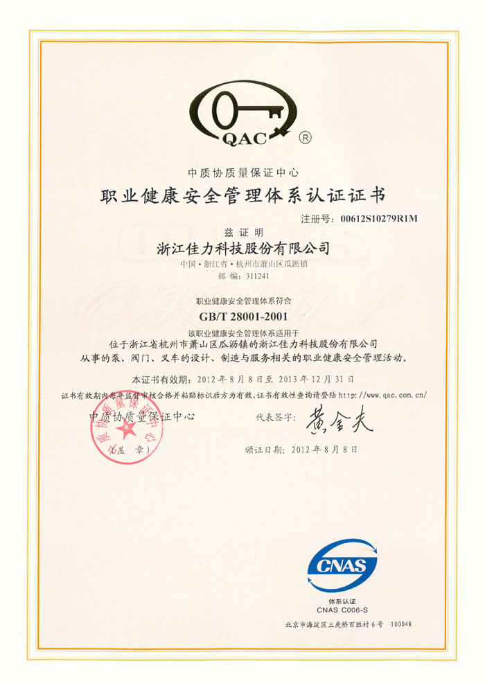 職業(yè)健康安全管理體系認(rèn)證證書