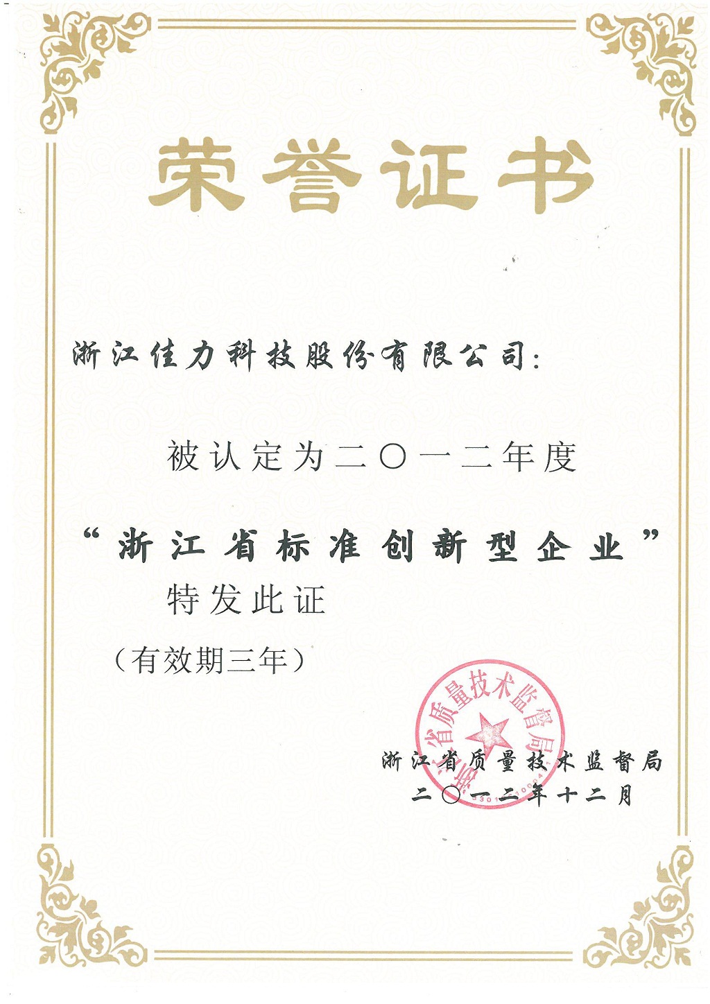 浙江省標準創(chuàng)新型企業(yè)證書